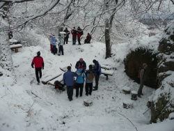 Ešte nevyhnutné vinšovanie k dnešným meninám a Števko Adamík vie, čo sa patrí. Ani dnes nezabudol na fľašku domoviny a každému kto môže piť, nalieva (väčšine). Presun na Ondrašovú zahajujeme netradične autami. čím si mienime značne skrátiť cestu. Po pár minútach zanechávame posledné domy za chrbtom a pomaly stúpame cez Štepicu pod Šimonov (457 m.), kde sa nachádza malá jaskynka pri ktorej sa zastavujeme. Som prekvapený zmenou od poslednej návšteve tohto miesta v jeseni. Tentoraz obdivujeme jaskyňu a sme očarení bohatou kvapľovou výzdobou. Aj keď sú kvaple len z vody a ľadu, je to úžasné dívať sa na množstvo cencúľov visiacich zo stropu. Nechce sa mi túto krásu opúšťať ale musíme ísť ďalej. Po nejakej chvíľke nachádzame chodník na hrebeni ale i Jozefa Balážku so psom, ktorý sa k nám pripája a spoločne vystupujeme na Michalov vrch – bývalé hradisko. Výhľady sú krásne, ale po občerstvení sa poberáme ďalej lebo sa rozfúkalo, zachádza za nechty a podaktorí si spomenuli na teplo domova. Na Ondrašovej sa rozchádzame. Časť ide pešo cez Kolačno do Uheriec, my ostatní, ktorí si nechceme zodrať nohy, sadáme do áut a frčíme domov. Tentokrát sme nepodávali ktovieaké výkony, bola to len malá prechádzka po blízkom okolí, ale stála zato. Veď čo môže byť krajšie ako stráviť v prírode pár chvíľ s príjemnými ľuďmi.