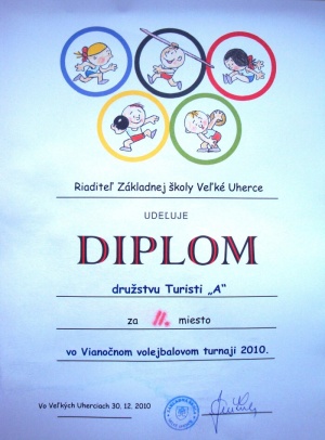 Tohtoročný vianočný volejbalový turnaj poriadaný ZŠ Veľké Uherce prekvapil účastníkov aj divákov počtom zúčastnených družstiev - 11. Pod značkou turistov štartovali dve družstvá A a B.